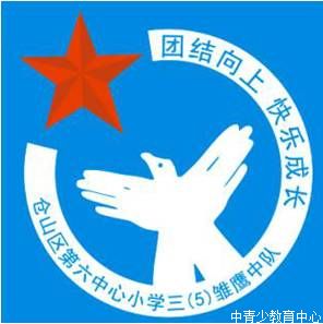 双手构成的雏鹰展翅手势造型表现童年时代的童真与欢乐,也传递了双手创造无限可能的寓意。图中雏鹰形态积极向上,奋力飞翔与中队"团结向上,快乐成长"的口号一致。logo采用红蓝两色,色彩鲜艳明快,蓝色代表天空表达了天高任鸟飞的意境,红星代表少先队员们童心向党!