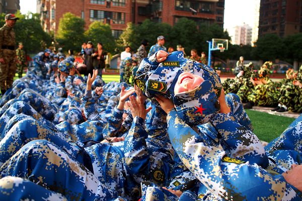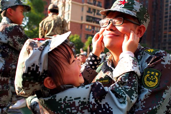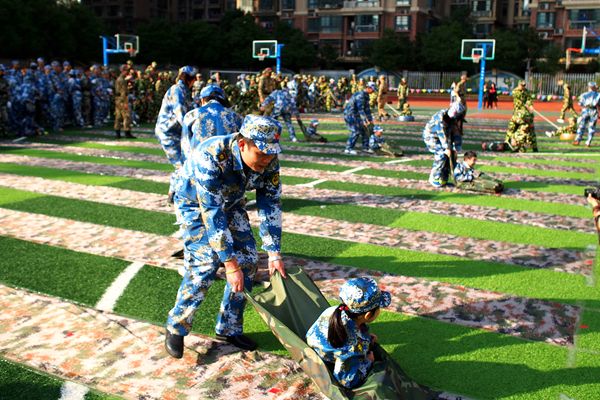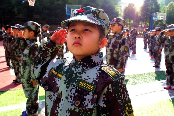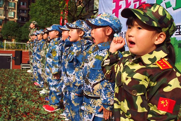 宽阔的操场上,踏着激昂的军歌,500多对亲子手拉手整齐列队进场,他们被分为海陆空三个方阵六个纵队,并身着三军特色迷彩服,站姿威严而有气势。活动现场举行了隆重的升国旗仪式,全体“战士”敬礼唱国歌,场面壮阔,气势恢宏。随后,“大小兵”代表登台宣誓,立志将发挥不怕难不怕苦的红军精神,在军旅体验过程中坚强面对各种困难,彼此帮助,共同完成活动预定的各项目标。